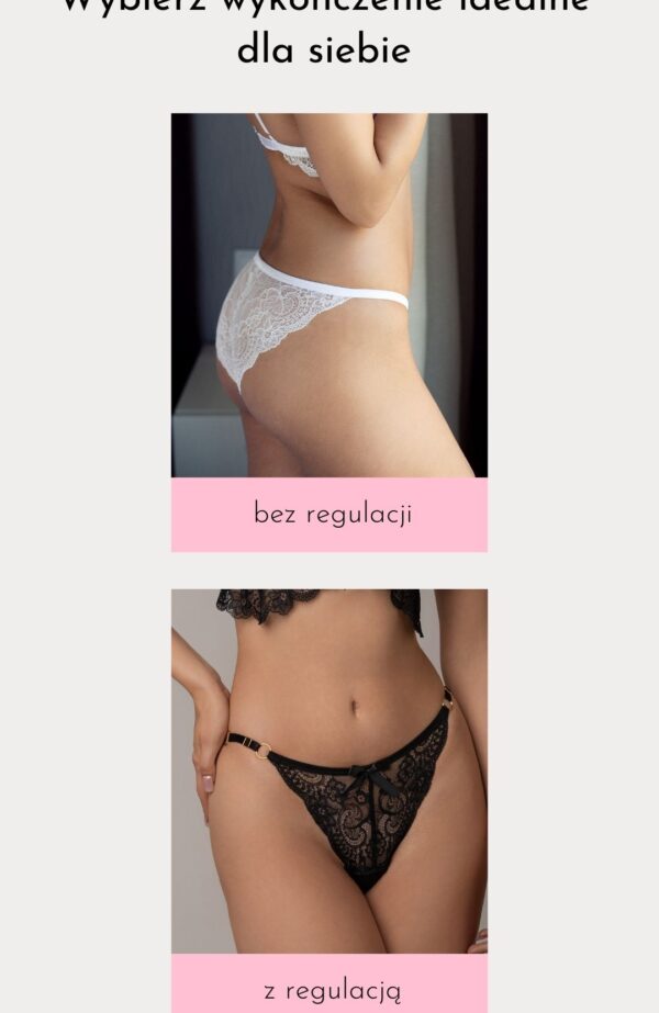 * Wersja nowoczesna (z regulacją): Stworzone dla kobiet, które chcą perfekcyjnie dopasowywać obwód bielizny do swojego ciała. W tej opcji boki zwieńczone są kółeczkami, pomiędzy którymi wszywamy miękką, pracującą z ciałem gumę ramiączkową z regulatorem. Co ważne, kolor metali dobierzemy tak, by stworzył komplet z biustonoszem Almond White, jeśli go zakupisz – w odcieniu złota lub srebra.
